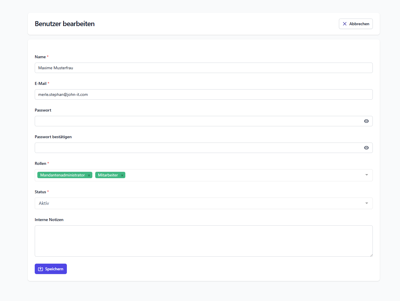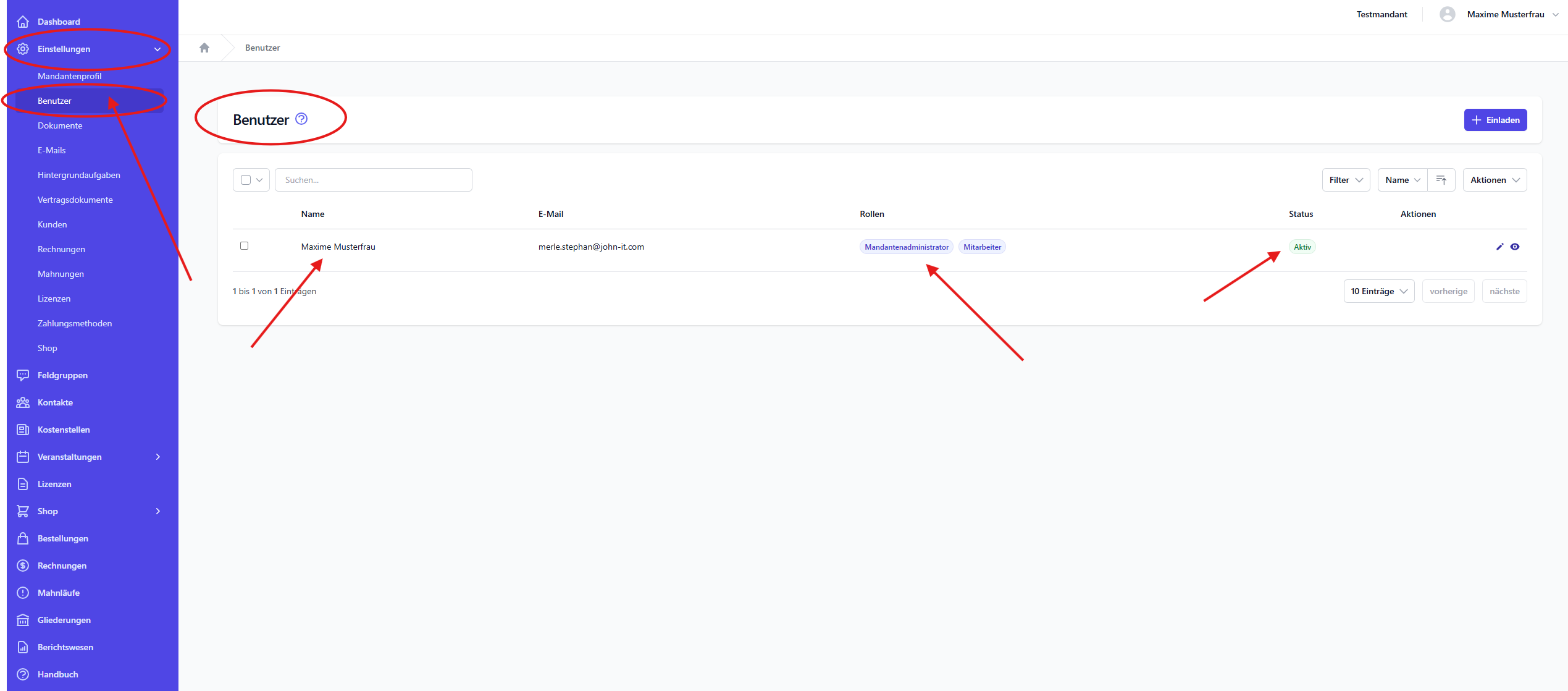 In der Benutzerverwaltung kannst du alle Benutzer deines Mandanten einsehen und verwalten. Hier kannst du neue Benutzer hinzufügen, bestehende Benutzer bearbeiten und deren Zugriff auf das System steuern.