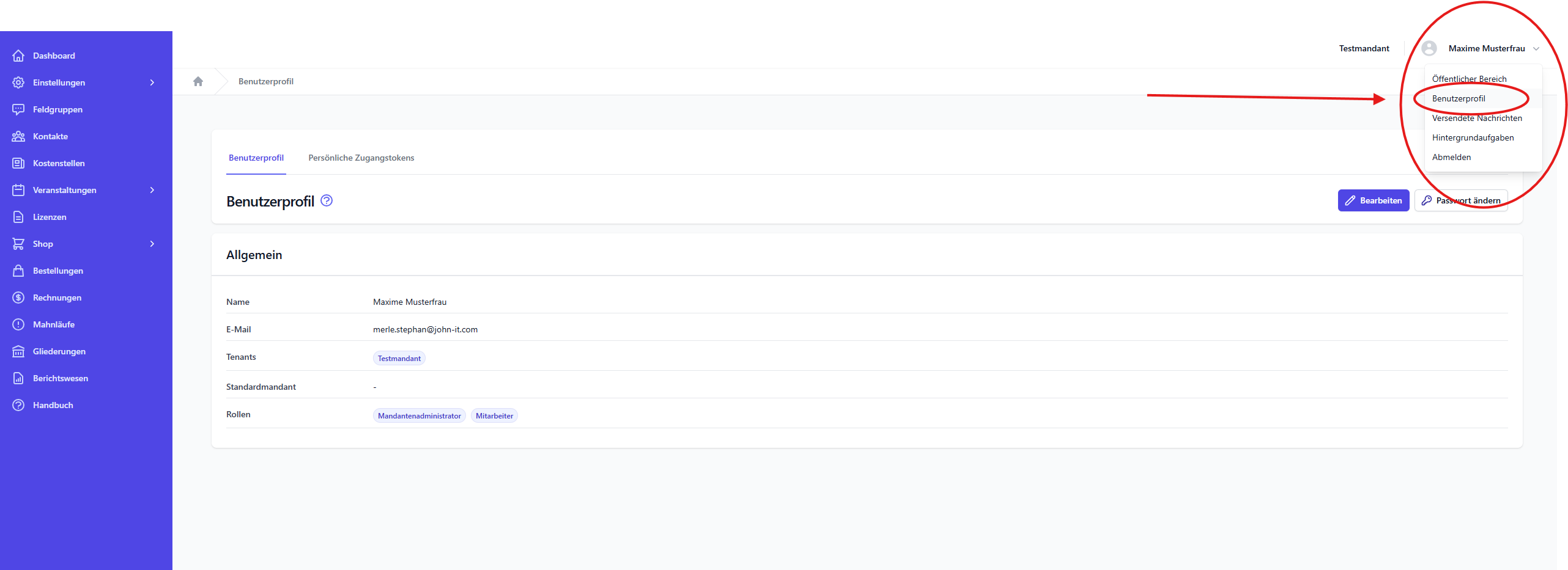 Welche Informationen du ändern kannst, hängt von deinen Berechtigungen ab. Einige Felder, wie Mandanten oder Rollen, können nur von einem Administrator angepasst werden. Deinen Namen und deine E-Mail-Adresse kannst du über den Button Bearbeiten selbst anpassen.