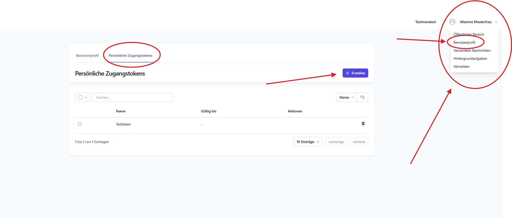 Du findest den Bereich für persönliche Zugangstokens in deinem Benutzerprofil. Öffne dazu das Benutzermenü, wähle Benutzerprofil und gehe anschließend in den Reiter Persönliche Zugangstokens.