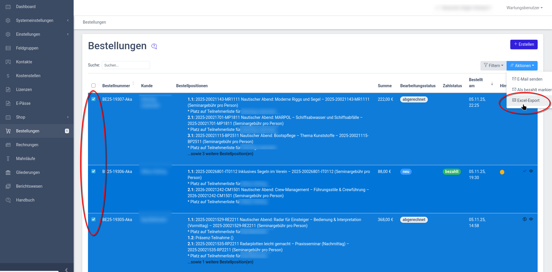 Sie die ausgewählten Bestellungen über Aktion -> Excel-Export als Excel-Datei