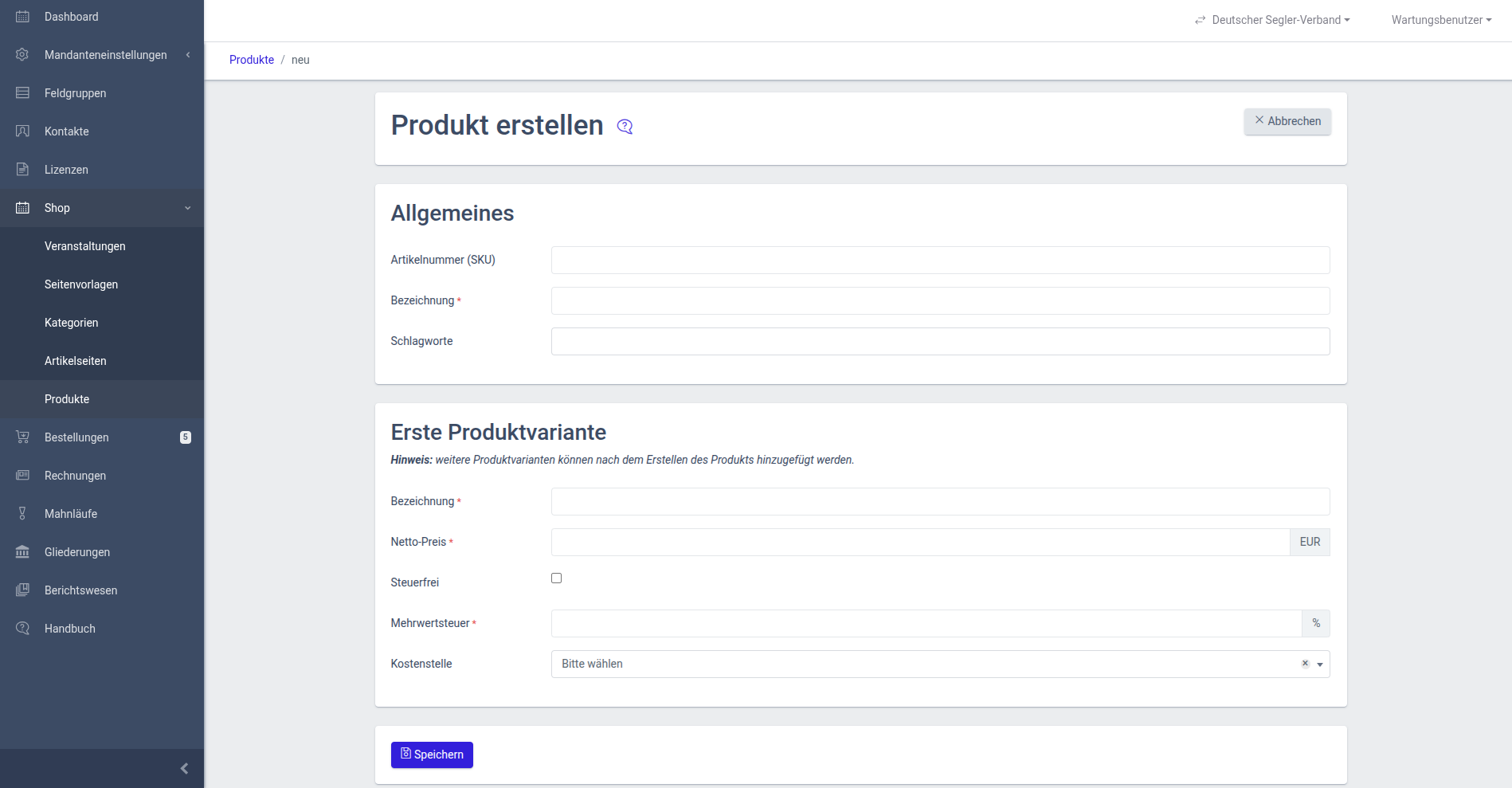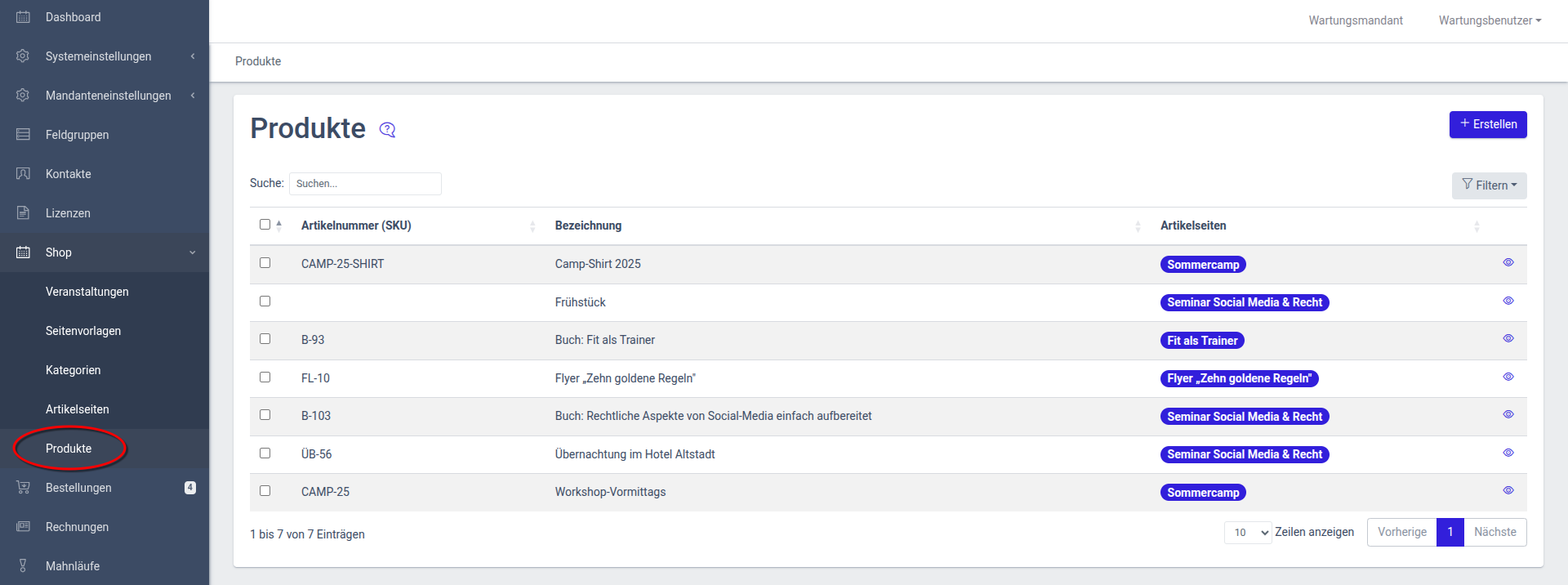 Die Verwaltung von Produkten finden Sie im Hauptmenü unter Shop -> Produkte.