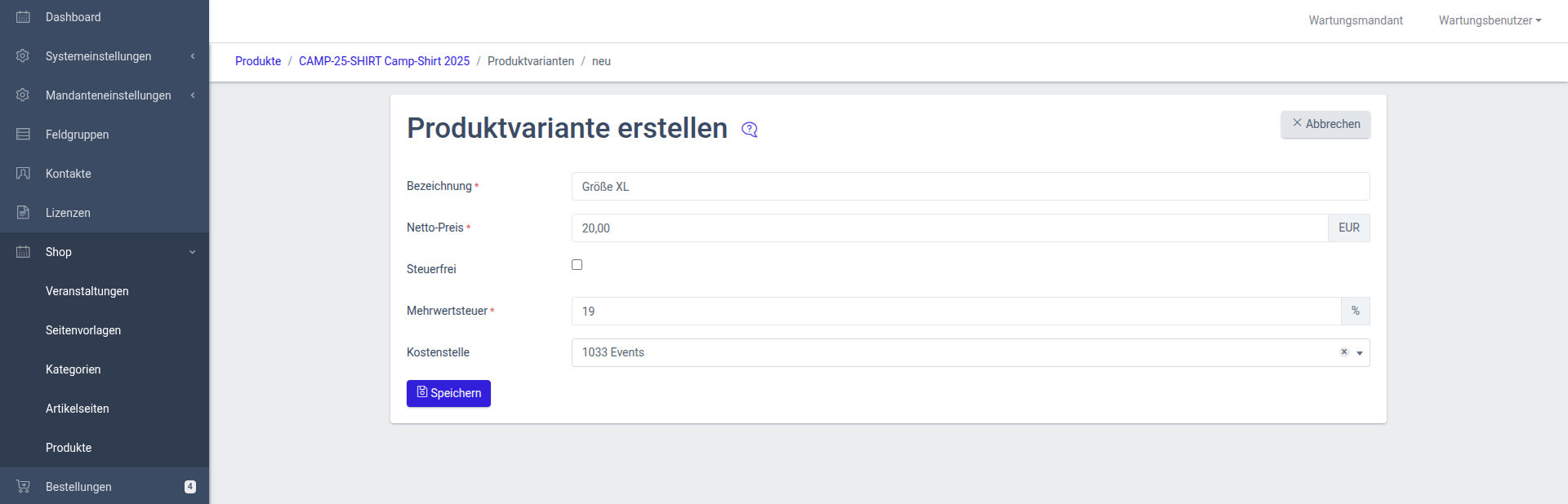 Jede Produktvariante kann einer Kostenstelle zugewiesen werden. Diese wird im erweiterten Rechnungsexport mit ausgegeben.
