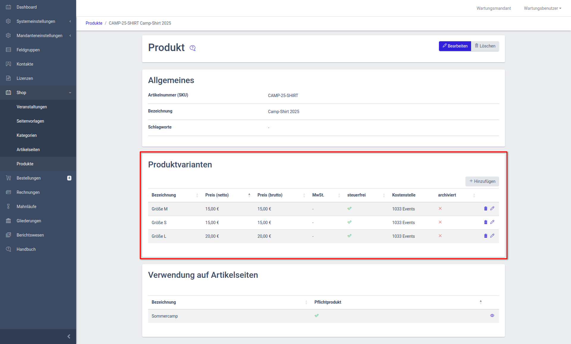 zu einem Produkt hinzuzufügen, rufen Sie das Produkt unter Shop -> Produkte auf. Führen Sie